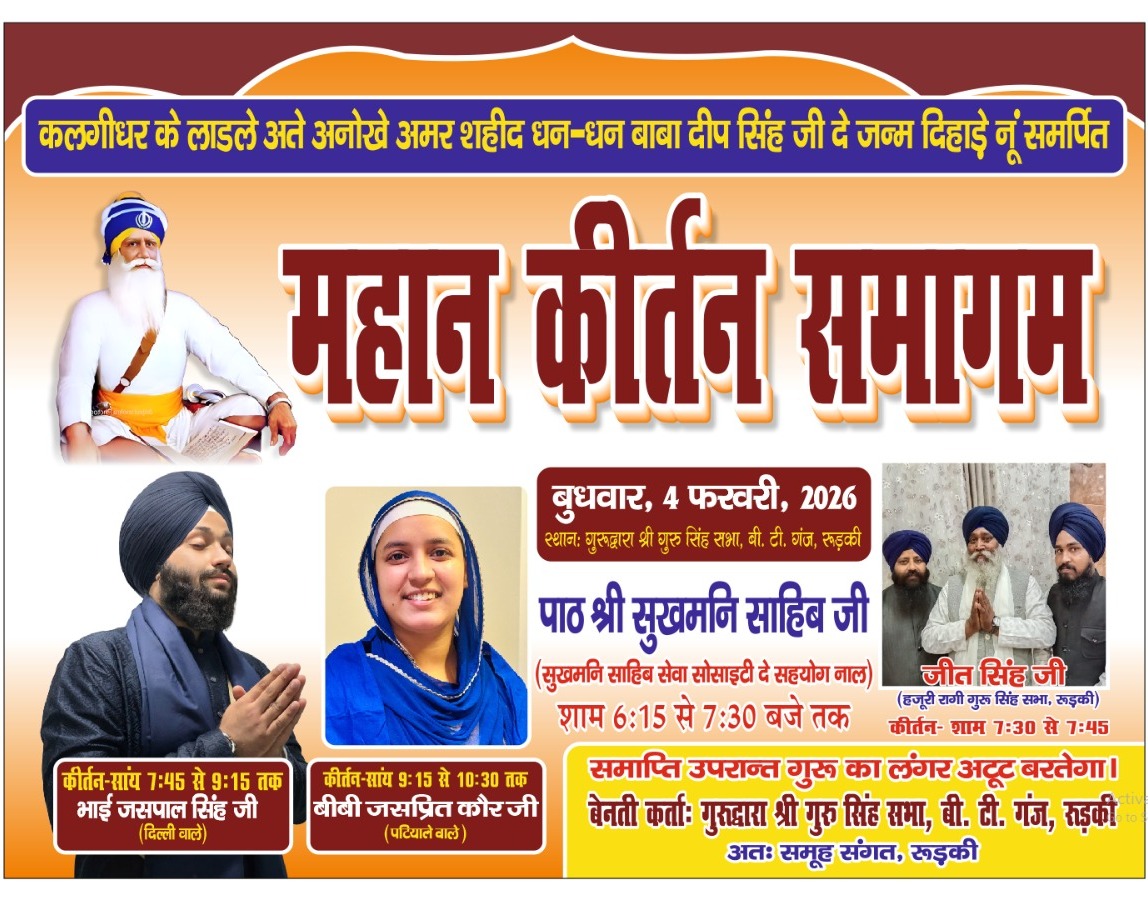 रुड़की। कलगीधर के लाडले, अतुलनीय अमर शहीद धन-धन बाबा दीप सिंह जी के जन्म दिवस के उपलक्ष्य में एक महान कीर्तन समागम का आयोजन बुधवार, 4 फरवरी 2026 को किया जाएगा। यह धार्मिक कार्यक्रम गुरुद्वारा श्री गुरु सिंह सभा, बी.टी. गंज, रुड़की में श्रद्धा और भक्ति भाव के साथ संपन्न होगा।