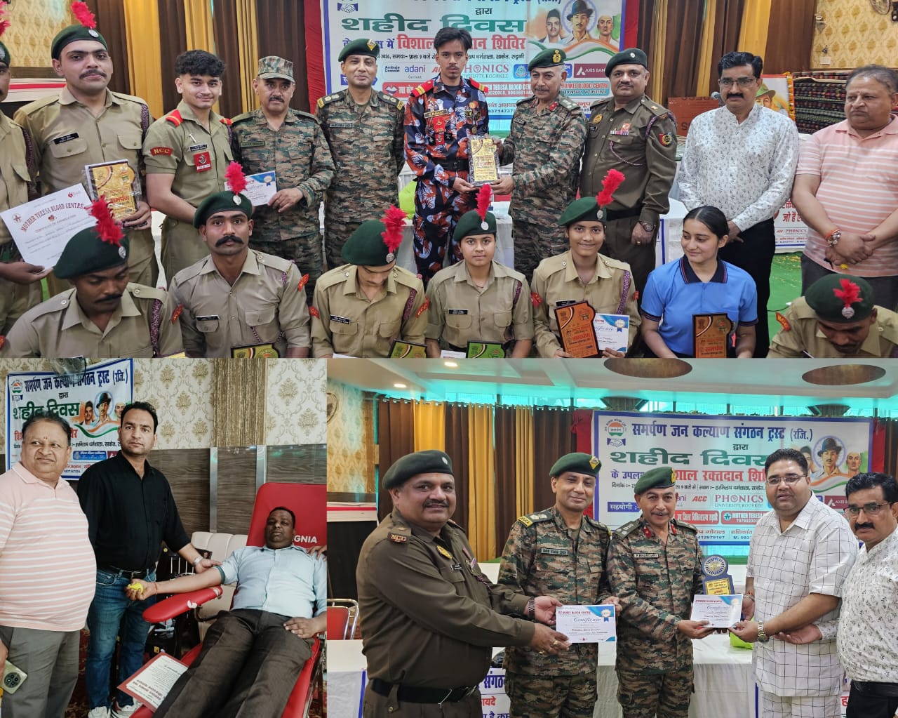 रुड़की। शहीदों की चिताओं पर लगेंगे हर बरस मेले, वतन पर मिटने वालों का यही बाकी निशा होगा"इन पंक्तियों को चरितार्थ करते हुए आज अमर शहीद बलिदानियों की स्मृति में रुड़की के हरमिलाप धर्मशाला में एक विशाल स्वैच्छिक रक्तदान शिविर का आयोजन किया गया। समर्पण जन कल्याण संगठन (रजि०) और 84 उत्तराखंड वाहिनी एनसीसी, रुड़की के संयुक्त तत्वावधान में आयोजित यह शिविर पिछले 30 वर्षों से चला आ रहा है।