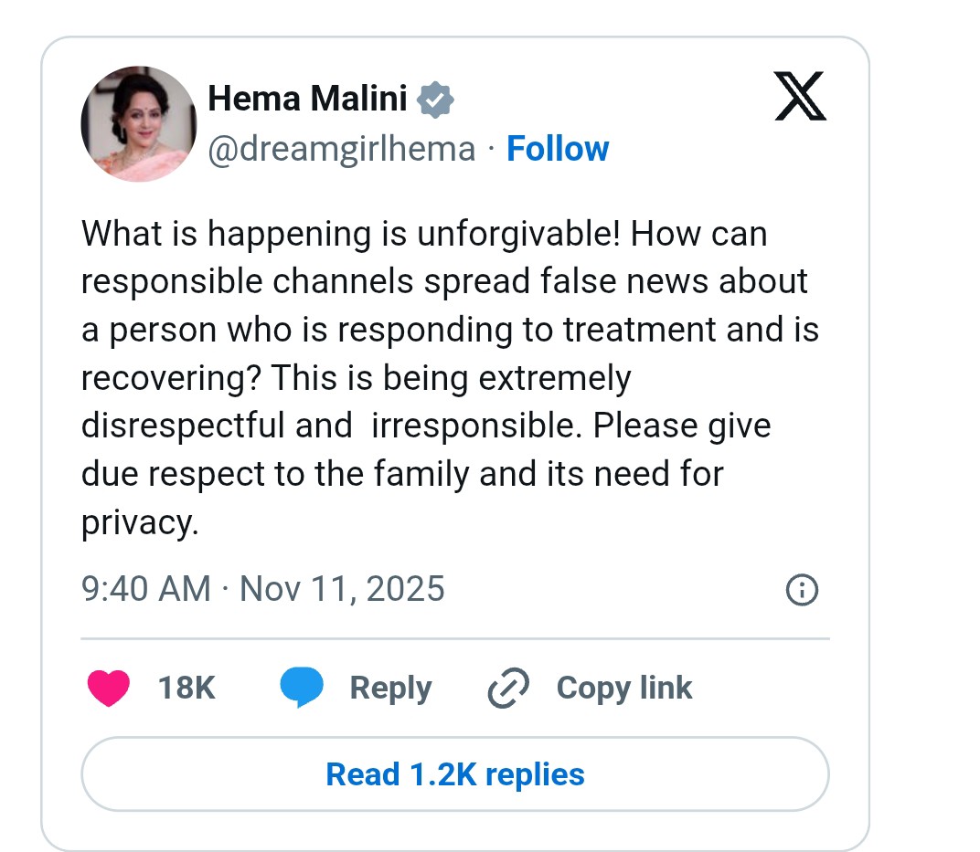 हेमामालिनी ने एक्स पर पोस्ट की है जिसमें मीडिया चैनल्स की रिपोर्ट को झूठा बताते हुए नाराजगी जताई है। हिंदी सिनेमा के दिग्गज एक्टर और ‘हीमैन’ के नाम से मशहूर धर्मेंद्र की लगातार निधन की खबर आ रही थी।